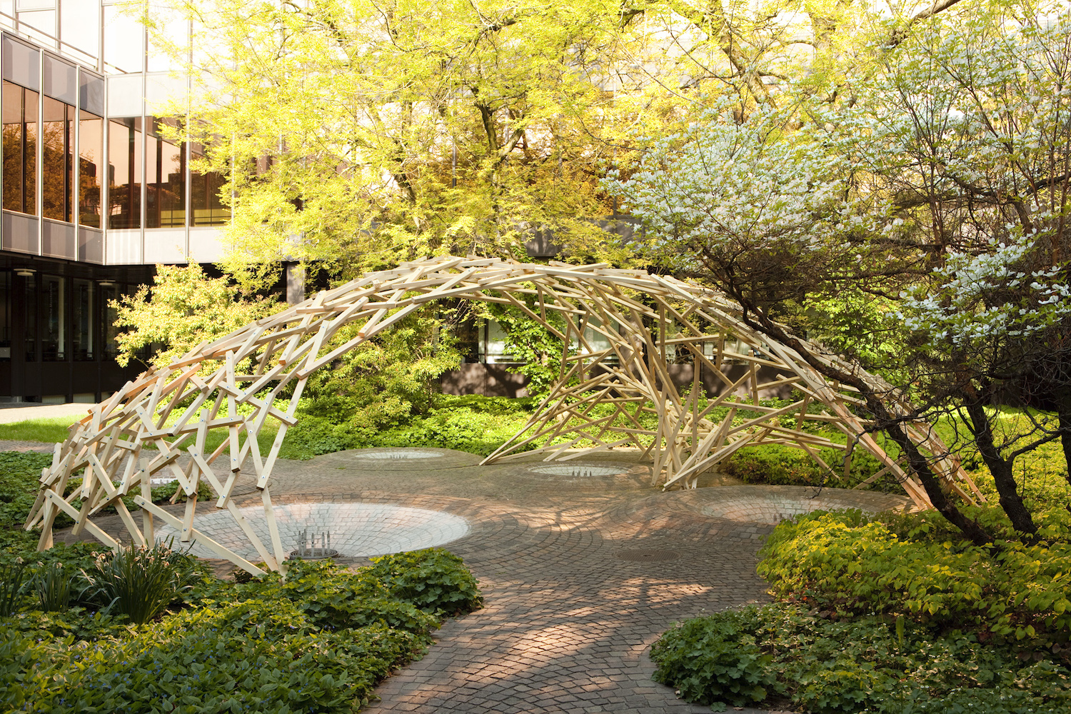 Villa Hatt CanopyIn this pergola for the ETH guesthouse an inner reciprocal frame lattice is enhanced on the principle of the Leonardo-da-Vinci bridge. The material is hardwood, the production was done by conventional a joinery machine.